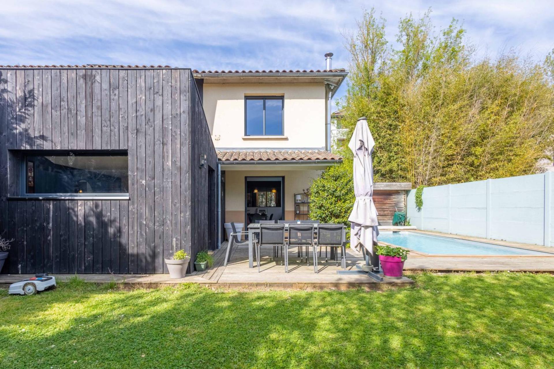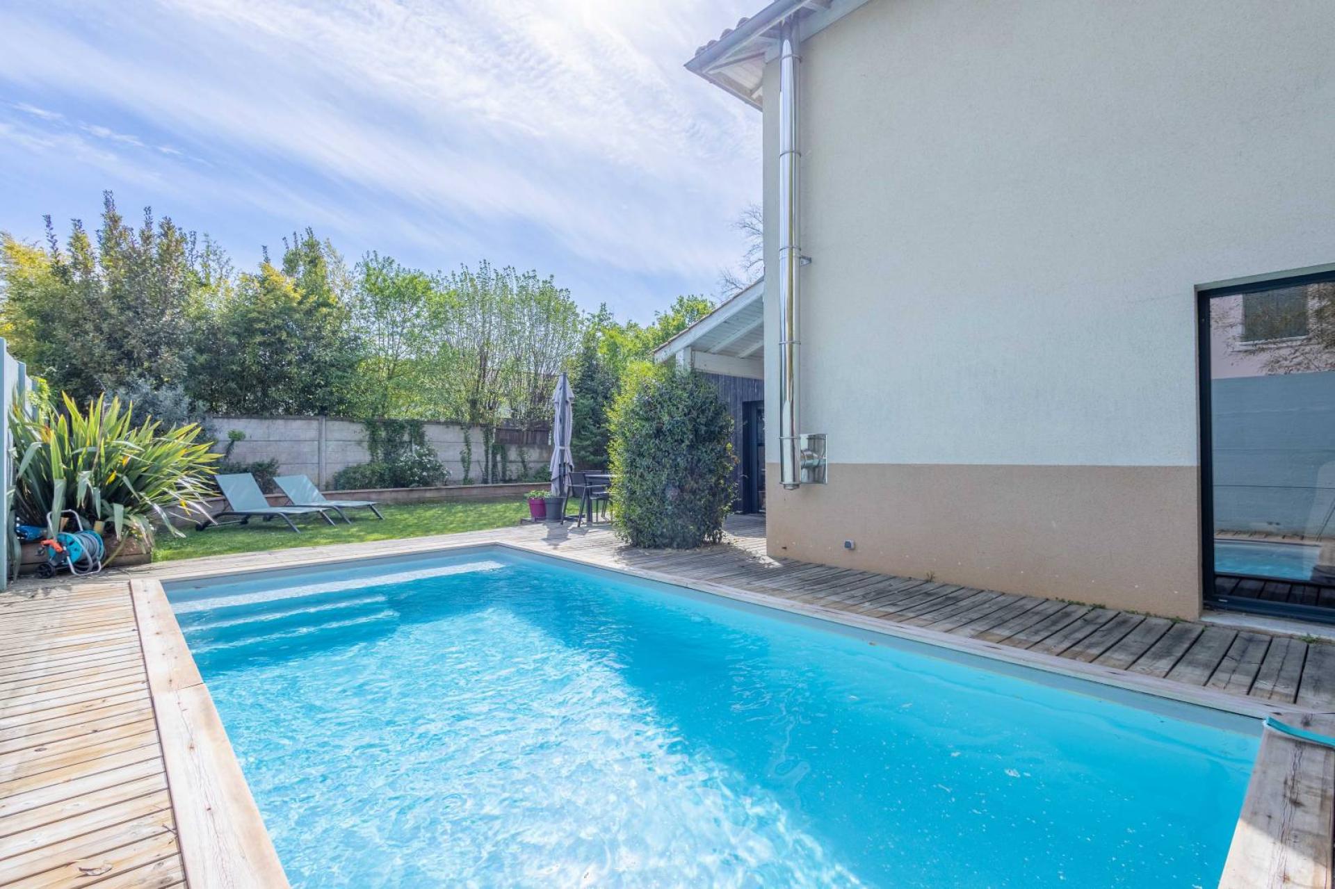 Joli jardin exposé sud sur l'arrière avec piscine chauffée.
