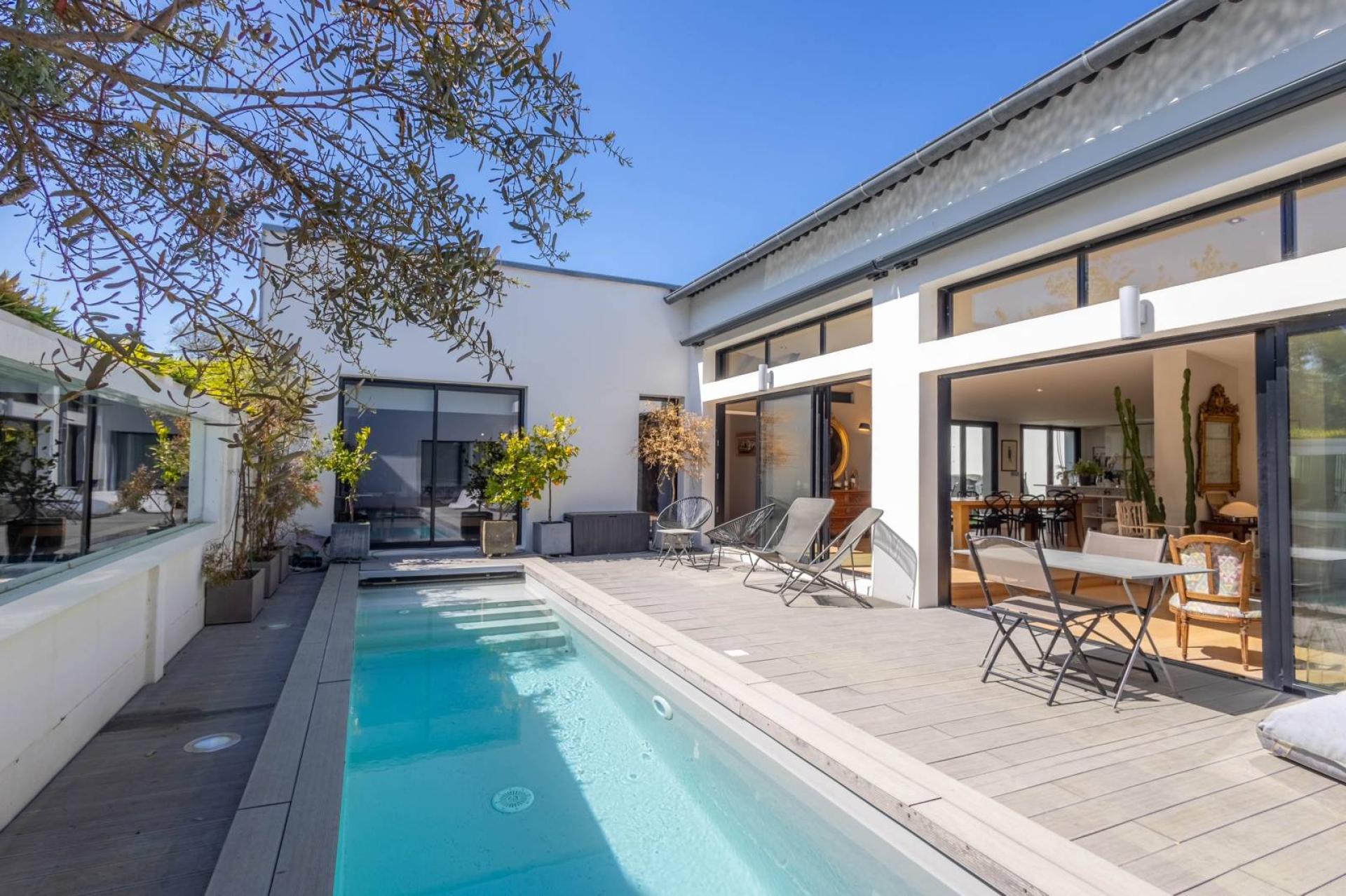 Entrée spacieuse, très belle pièce de vie lumineuse de 100m² avec cuisine ouverte équipée donnant sur terrasse exposée sud avec piscine et sur patio, 3 chambres dont une suite parentale, salle de bain…